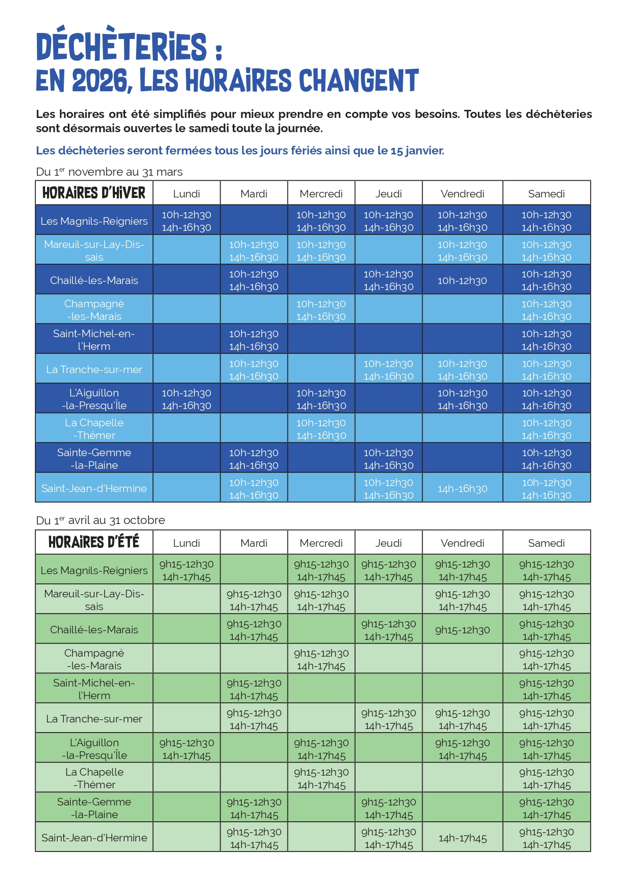 - Nalliers : ZA les Plantes / Parking salle omnisports / Plateforme de valorisation des déchets 2024 ouverte tous les samedis matins de 9h à 12h.